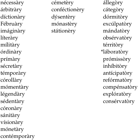 (d) Forms ending in [εɹ̣i] (spelt -ary/-ery) and [ɔɹ̣i] (spelt -ory) receive a secondary stress on the penult in AE, whereas the same syllable has a reduced vowel in BE. For example, the word secondary is [sékəndὲɹ̣i] in AE, but [sέkəndəɹi] in BE, which can turn into [sέkəndɹi] by way of deleting the reduced vowel, and thus reducing the number of syllables to three. The following list consists of such items: