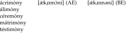 A similar pattern to the above list (secondary in AE, reduced vowel in BE) is obtained in words ending in -mony: