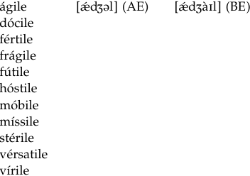 (e) The other group of words (all ending in -ile) that behaves differently in the two varieties shows the reverse (i.e. reduced vowel in AE, but secondary stress in BE):