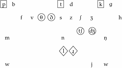 The overlay of the native phonemes onto the target English inventory gives us the following picture: