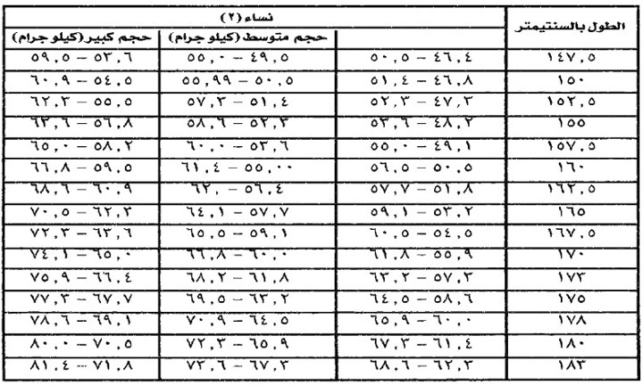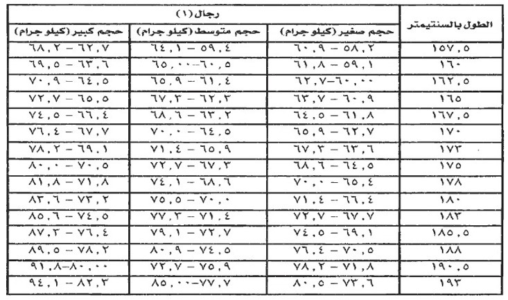 يتبين أن الوزن المثالي للرجل تحت طول 165 سنتيمتراً وحجم الجسم المتوسط هو 62,3ــ67,3 كيلوجراماً، أي المتوسط 65 كيلوجراماً.