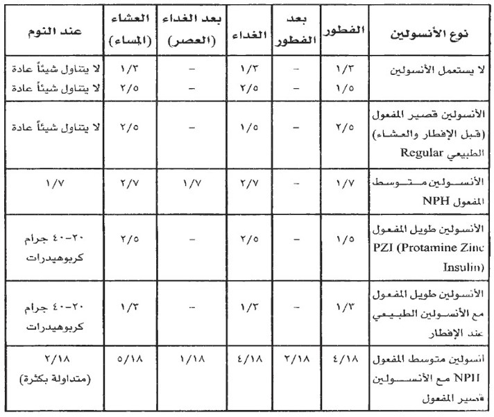 ** يمكن إعطاء الحمية الغذائية أعلاه لمريض السكري الذي يستعمل الأنسولين (NPT) (متوسط المفعول) بعد إجراء التعديلات الآتية: