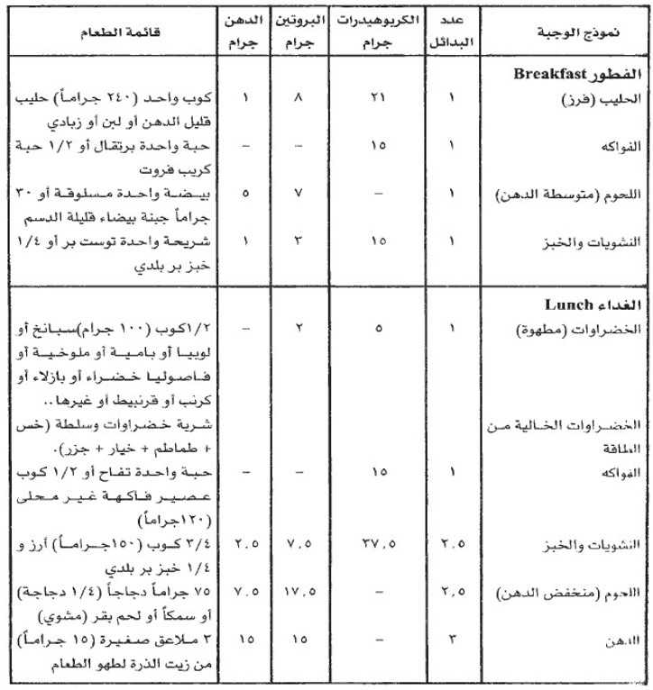 وذلك بناءً على كمية الطاقة التي يحتاجها يومياً. ويوصى عادة باختيار بدائل الحليب الخالية من الدهن وبدائل الخبز والنشويات قليلة الدهن وبدائل اللحوم منخفضة الدهن. وفيما يلي عدد البدائل الغذائية التي يحتاجها مريض السكري لتزويده بحوالي 1600 سعر يومياً، بالاسترشاد بجدول رقم التالي: