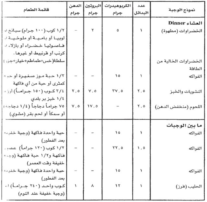 مثال لتوضيح طريقة تخطيط وجبة غذائية لمريض السكري غير المعتمد على الأنسولين: