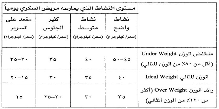 بما أن احتياجات الطاقة = 25 سعر لكل كيلوجرام من وزن الجسم كما في الجدول