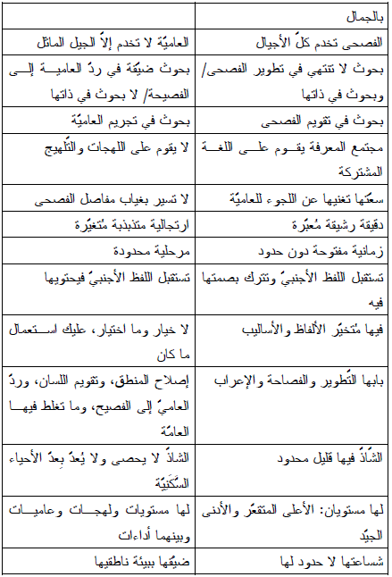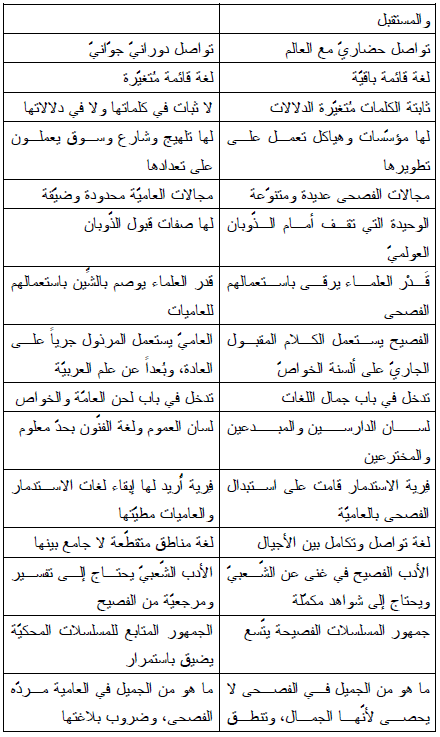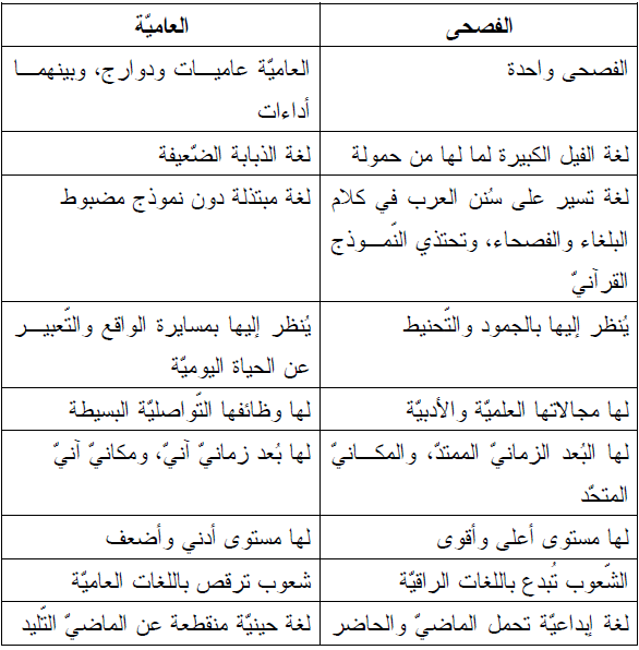 وفي هذا المقام ننقل للقارئ نصين لعالمين عربيين يقدّمان صورة للفصحى وللعاميّة؛ بإنصاف .مبين. يقول الجاحظ "... ليس في الأرض كلام هو أمتع ولا آنق ولا ألذ في الأسماع، ولا أشدّ اتصالاً بالعقول السليمة، ولا أفـــق للسان، ولا أجود تقويماً للبيان من طول استماع حديث الأعراب العقلاء الفصحاء".