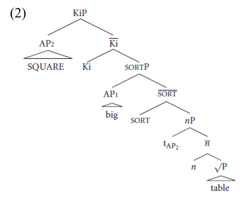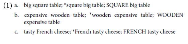 This is illustrated in the tree below, making some assumptions (discussed below) about attachment sites for different classes of adjectives.