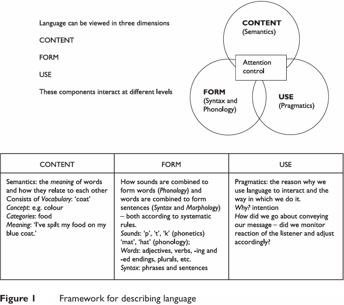 Speech and language therapists have traditionally used the linguistic model described in Figure 1 (Bloom and Lahey, 1978). Assessments based on this model seek to describe language in term of these functions and identify where to focus therapy and or the ‘extra or different provision’ that might be needed in educational contexts via Individual Education Plans (IEPs) (DfES, 2001a). For many children with SLCN their difficulties seldom fall into ‘neat’ categories of content, form and use due to the interdependence of these areas of language and communication.