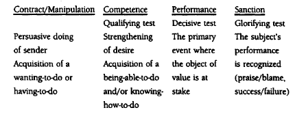 Semiotic analysis of this level of meaning makes use of two fundamental narrative models: (1) the actantial narrative schema and (2) the canonical narrative schema. These models jointly articulate the structure of the quest or, to be more precise, the global narrative programme of the quest. They can be applied to an extract, for example, a single paragraph or to a whole text.