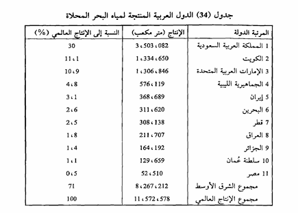 لقد أتاح استخراج النفط بكميات كبيرة وتوفر الإنفاق اللازم للبدء في مباشرة تحلية مياه البحر منذ أكثر من عقدين في منطقة الخليج العربي وفي العديد من الدول الأخرى في المنطقة، ولهذا لا نستغرب أن نعلم أن أكثر من سبعين في المائة من جملة المياه البحرية المحلاة في العالم توجد في منطقة الشرق الأوسط وبالذات التي تملك منها دخلاً سخياً من صادرات النفط كما هو موضح في الجدول التالي.