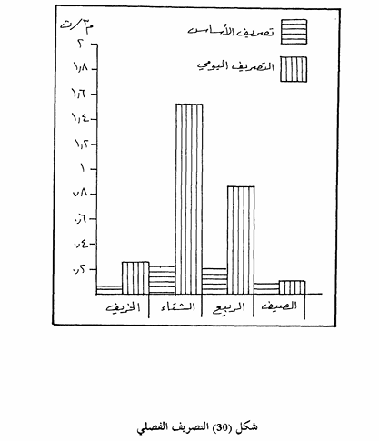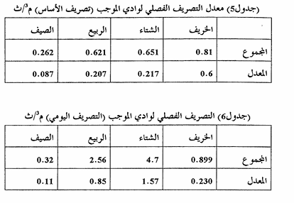 أما التصريف الفصلي لمياه وادي الموجب، فيظهر فيه الاختلاف واضح جدا حيث نجد أن أعلى كميات تصريف تسجل في فصل الشتاء بمعدل 1.75م/ث، بينما ينخفض التصريف الفصلي في فصل الربيع الى 15. م / ث ثم في الخريف الى 0.26مث، بينما يسجل فصل الصيف أدنى تصريف لوادي الموجب حيث يبلغ 11 م /ث فقط جدول (5) (شكل 30).