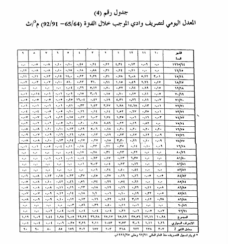 ومن خلال الجدول (4) يتبين أن أكثر السنوات المائية رطوبة كانت السنة المائية 1965/64 حيث سجل أعلى حجم تصريف ماتي فيها، اذ وصل الى 11.76م/ث، تلتها السنة المائية 88/87 والتي بلغ فيها حجم التصريف الماني 68.24م / ث ثسم السنة المائية 72/81 حيث بلغ حجم التصريف فيها 59.08م / ث وسنة 1/70 وبلغ فيها حجم التصريف السنوي لوادي الموجب 57.6 م /ث بينما سجلت كميات قليلة في سنوات الجفاف ففي عام 1991/90م سجل أقل معدل تصريف سنوي خلال فترة الدراسة وصل الى 1.45م/ث وسنة 83/82 بلغ فيها حجم التصريف 3.75م/ث . أما الأعوام 77/76 و 79/78 فقد سجل حجم التصريف فيهما على التوالي 4.31 م / ث و 4.2 م / ث . في الوقت الذي بلغ فيه معدل حجم التصريف السنوي 22.12 م.