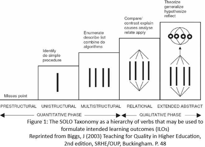 The crucial task of defining the ILOs is aided by using the SOLO taxonomy (Biggs & Collis, 1982). ‘SOLO’ stands for Structure of the Observed Learning Outcome. SOLO is a general framework describing the evolution of learning, from learning as a quantitative increase in knowledge, to learning as becoming structured in qualitatively more complex ways. The following stages are distinguished: