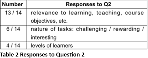 Overwhelmingly, the interviewees consider relevance to teaching and learning as the most important element in designing their assessment tasks. This reflects that the alignment between the goals of teaching and learning and the assessment tasks is of top priority among this group of staff members, a phenomenon which is encouraging as far as the implementation of SOLO is concerned.