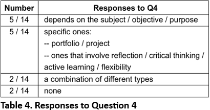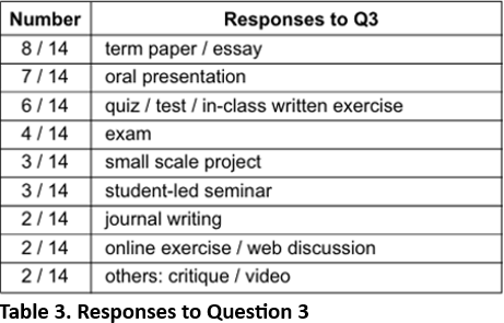 Question 3 asks: "What types of assessment tasks have you used in your teaching (e.g. exam, term paper)?"