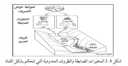 يتذبذب تدفق الرواسب بمرور الوقت مما يعني أن التكيف المستمر يحدث من خلال التعرية وإعادة العمل وترسيب الرواسب إذ تسمى أنظمة التدفق والرواسب بالمتغيرات الضابطة Driving Variables لأنها تقود هذه العمليات وإن توفر الطاقة مهم أيضا، وغالباً ما تكون تعديلات القنوات محدودة للأنهار التي تتدفق على انحدارات متدرجة gradients ومنخفضة، خاصةً عندما تكون الضفاف متماسكة من قبل النباتات، وتسمى هذه القيود بالظروف الحدودية boundary conditions وتشمل حصر الوادي وركيزة القناة substrate، ومنحدر الوادي ونباتات الضفاف الشكل (6ـ 2) الذي يمثل المتغيرات الضابطة والظروف المحيطة بها التي تؤثر على شكل القناة عندما تكون القناة في النظام يتذبذب شكلها حول حالة توازن على مدار نطاق زمني معين ولكن ليس كل القنوات في النظام إذ ان هناك العديد من الأمثلة على القنوات غير نظامية أو غير متوازنة لأن القناة تتطور لاستجابة لفترة طويلة في نظام التدفق أو الرواسب الناجمة عن تغيـر فـي احدى ضوابط الحوض الخارجية ومن الأمثلة على ذلك قنوات التعميق incising أو البناء aggrading وتلك التي تمر بتغير في نمط القناة، يتم تحديـد متغير قوة التدفق المتاح على امتداد معين من خلال التصريف ومنحدر الوادي، على مقياس المقطع الثانوي sub-reach scale، وهناك اختلافات مكانية في إنفاق الطاقة والتي تنتج عن الاختلافات في شكل القناة ومقاومة التدفق، إذ يقود إلى تحويل تأثير أنماط التعرية والترسيب.