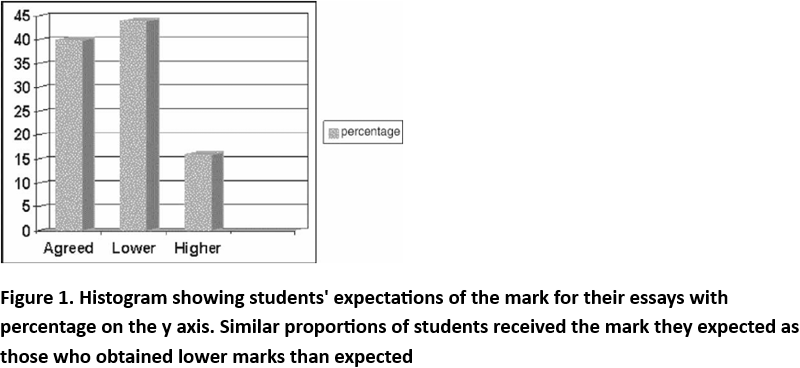 When students were asked to reflect on the mark awarded compared to their expectations of the mark they felt they should have received, 40% students agreed that the mark was as they expected; 44% said it was lower than expected and just 16% felt that it had exceeded their expectations (Fig.1).