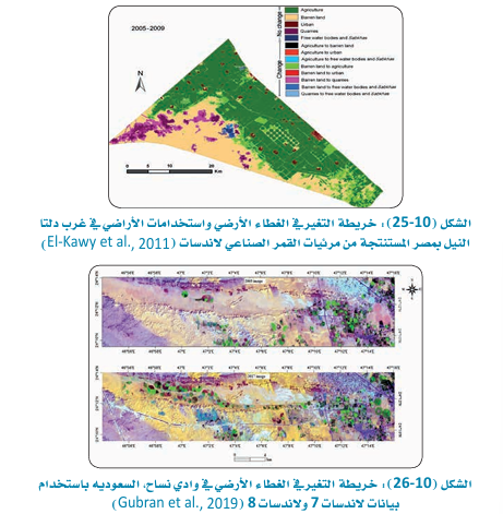 يشيرمصطلح الغطاء الأرضي الى كل ما يغطي سطح الأرض مثل النباتات والمنشئات والمياه والتربة، أما استخدام الأراضي فيشير الى الهدف الذي تخدم من اجله الأرض كالزراعة والصناعة والعمران وتعد بيانات الاستشعار عن بعد مفيدة في الحصول على خرائط محدثة للغطاء الأرضي واستخدامات الأراضي للمناطق الشاسعة في أي وقت محدد وكذلك مراقبة التغييرات التي تحدث فيها من وقت لآخر. فيمكن استخدامها لمراقبة التوسع العمراني للمدن وتناقص الرقعة الزراعية ولتحديث خرائط الطرق وبالتالي فان الاستشعار عن بعد يعد اداة مهمة للغاية لوضع خطط التنمية العمرانية حتى لا تجير على الأراضي الزراعية ، فقد تساهم المرئيات في اختيار أفضل المواقع لإقامة المنشآت العمرانية والصناعية والهندسية كالسدود والطرق والسكك الحديدية، والأنفاق، ومحطات الطاقة المختلفة ، ومن هنا فمثل هذه التطبيقات تعتمد على خاصة التكرارية للمرئيات الفضائية وتحتاج لدقة مكانية عالية بهدف التحديد الدقيق للمناطق المختلفة والقدرة على التميز بين الاستخدامات المختلفة. الشكل (10-26) يوضح التغير في الغطاء الأرضي في وادي نساح المملكة العربيه السعودية باستخدام بيانات لاندسات 7 ولاندسات 8 حيث أظهرت النتائج وجود تغير في الغطاء الارضي وخصوصا الانشطة الزراعيه في الفتره ما بين 2003 و 2017.