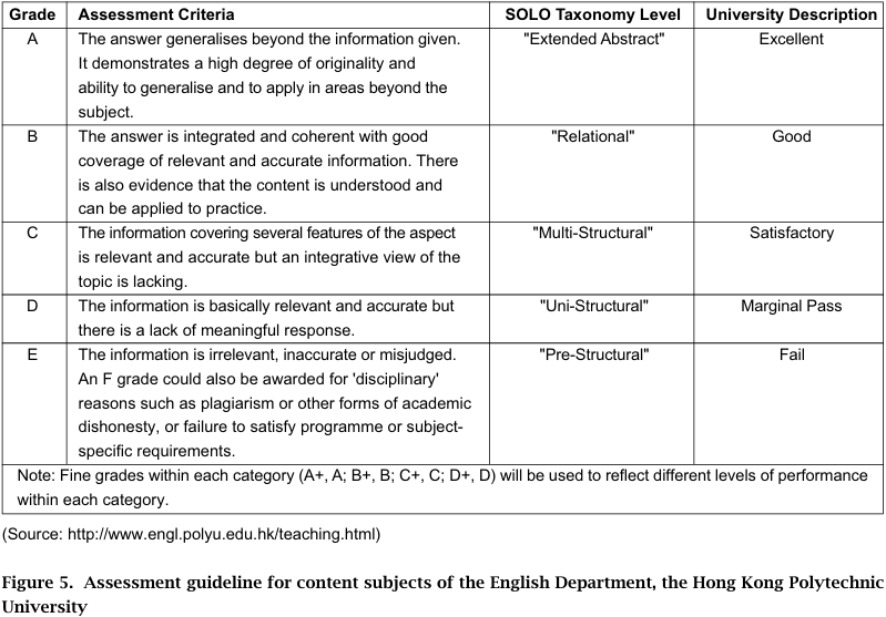 The English Department has a general guideline that all content subjects are assessed using Biggs & Colins' (1982) Structure of the Observed Learning Outcomes (SOLO) taxonomy (Figure 5), which is a method to categorize students' responses to open-ended questions, and focuses on qualitative differences between students' responses. According to Biggs (2003, p.37), when students learn, they produce learning outcomes that display "similar stages of increasing structural complexity", and the SOLO taxonomy provides a systematical description of "how a learner's performance grows in complexity when mastering many academic tasks".