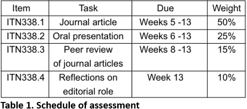The journal article itself (ITN338.1) was weighted at 50% of the total assessment, as it was regarded as the key independent learning activity with the emphasis placed on researching a topic of current interest. Some sample topics were provided, but students were encouraged to select an issue that they personally wished to examine. It should be noted that the actual research skills that underpin the development of the journal article represent a critical dimension of the successful library and information professional. As effective planning for the discrete issues of the online journal would contribute significantly to its success, the draft outline had a 5% weighting of its own, to ensure students do submit this promptly.