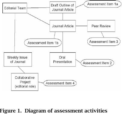 The academic staff hoped that the assessment activities would not only drive student learning, but would also encourage students to take responsibility for managing their own individual and collaborative learning activities to achieve the desired learning outcomes. The online journal was therefore central to learning and assessment in this unit, as illustrated in the diagram below: