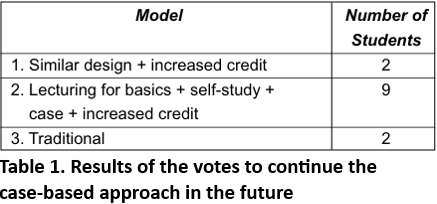 At the end of the focus-group meeting, students were given three options on improving the course and they were asked to vote. They were asked to vote concerning the types of course design they would like to see if they were to take this course again. The three options the students considered were: 1) keep the course similar, but increase the credit of the course; 2) keep the self-study and case-related parts, but include some lectures at the beginning of the course to talk about basics, and also increase course credit; and 3) revert to lecture-based and traditional design. Most students voted for the core elements of the case-based teaching to retain. Details of the vote are in Table 1: