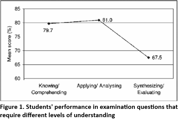 A positive effect on learning outcome was also evidenced by an analysis of students' learning outcomes on the final examination. The analysis was conducted based on Bloom's Taxonomy: the questions in the final examination were grouped into three different categories, according to their levels of cognitive reasoning required. The three categories are: 1) knowing/ comprehending, 2) applying/ analyzing, and 3) synthesizing/ evaluating. The classification of the questions was checked by fellow physicists and a science educator.