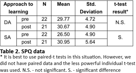 The SPQ data indicate the pressure students were under as well. The results are in Table 2. The students' deep approach scores increased, though not significantly. Their surface approach scores, however, increased more and this increase was statistically significant. Given the other data, we have about student's engagement in the course, our interpretation is that the workload pressure caused the students to feel they were attempting to 'cut corners' in the work they did.