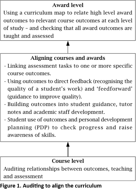 Figure 1 summarizes the audit process and links audit to curriculum alignment. In the highly modular course environment of the Open University explicitly linking outcomes, assessment, courses and awards is important. As adults already in employment many OU students will expect to use their studies and qualifications to improve their careers. Typically a student may spend about six years studying part-time with the OU.