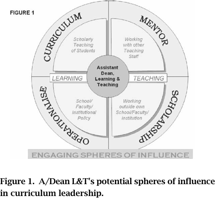 The context-embedded nature of this role lies at the heart of its potential to be a positive mechanism for facilitating the development and delivery of quality assured assessment policies, processes, structures and procedures in support of enhanced student learning outcomes. Under the auspices of the A/Dean's L&T role, it is organizationally possible to conceptualize how change, as the "complex learning and unlearning process for all concerned" (Scott, 2004) referred to above, might be managed and progressed by curriculum leadership at a variety of levels of engagement and influence. An attempt has been made to represent this conceptually and diagrammatically in Figure 1. In this conceptualization, the role is construed as a relational or holistic one, where the series of separate elements (Faculty, School, University and sectoral) are integrated into the sum of their parts. The concept envisages a structure that supports students and teachers through practice and scholarship.