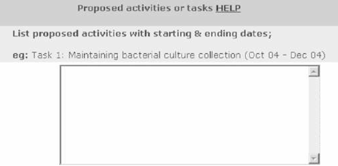 The next field on the web-form is a text-area into which the student enters the list of tasks they are hoping to perform on placement. The number and type of tasks are first negotiated with the work supervisor and agreed with the tutor. Each student lists between 5 and 10 tasks.