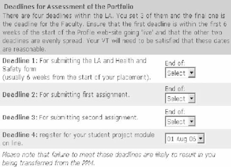 Four deadlines are set for the completion of the portfolio material. The final deadline is determined by us as all portfolios needed to be completed by 1 September for administrative purposes. The other deadlines are set by the student and agreed by the work supervisor and VT; these can vary according to the individual working practices of the placement but are spaced to ensure that the student works steadily on the portfolio rather than completing all the sections towards the end of the placement period.