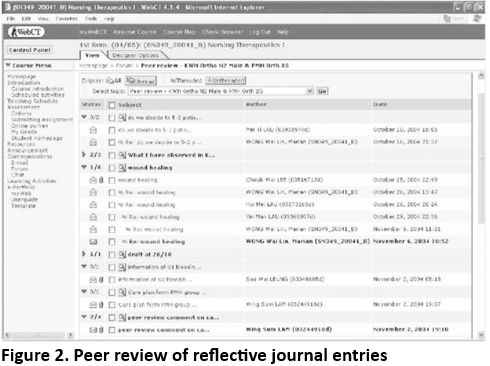 By providing the opportunity for teacher-student interaction on assessment, a staged process for assignments allows for online assignment submission with display of teacher comments. A teacher of a nursing subject asked her students (in groups) to post up their presentations, which could be in the form of PowerPoint presentation slides, video shows, booklets or web pages. All the productions were showcased to the whole class on a website and compiled as a "cybernetic show". The teacher believed that the task would enhance the students' interest and understanding of the issue through creative work. The "cybernetic show" comprised three sections - understanding, exercising and caring in community nursing. Students' projects were collected and displayed in the corresponding sections of the website (Figure 1). Each student group was assigned to any one of the three sections. In this case, the teacher provided her comments and discussed the pros and cons of each student project online The transparent communication between teacher and project groups enabled students to have a better understanding of the expectations of the teacher. In addition, the just-in-time comments allowed students to revisit and further improve their work.