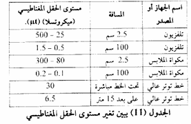 ولكن من المهم جدا التنويه إلى أن الدراسات بينت أن الحقول المغناطيسية الناتجة عن الأجهزة الكهربائية تنخفض بشكل كبير كلما تم الابتعاد عن الجهاز، ويقدر أن مدى الذبذبات الكهرومغناطيسية يتراوح بين 50 هرتز في خطوط نقل الطاقة و 1000 هرتز في الهاتف النقال، ويعتقد أن بعض الآلات الكهربية التي تستخدم بالتماس أو القرب من جسم الإنسان تشكل خطراً على صحته، والجدول (11) يبين مدى تغير شدة الحقل المغناطيسي، بالميكروتسلا (t)، وهي وحدة قياس الحقل المغناطيسي.