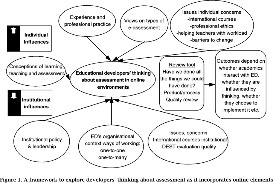 Critical elements which underpin educational development in the area of e-assessment include individual components such as the developers' conception of learning, teaching and assessment, their professional background and disciplinary orientation, their aware ness of the range of e-assessment options that can address diverse learning outcomes and the ways in which they identify and respond to critical assessment issues. In a sense though this is only half of the picture because institutional policy and leadership, how the developers' organizational context is conceptualized and the institutional quality/evaluation processes have significant impacts upon the thinking of developers.