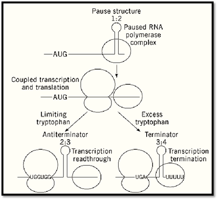 Figure 1. Model of transcription attenuation for the E. coli trp operon. RNA polymerase pauses following formation of the pause structure provides time for a ribosome to initiate translation of the leader peptide. Under tryptophan-limiting conditions, the ribosome stalls at the tandem Trp codons, resulting in transcription readthrough. Under conditions of tryptophan excess, the ribosome reaches the leader peptide stop codon. This ribosome position blocks formation of the antiterminator, leading to terminator formation and transcription termination. Adapted from Landick and Yanofsky (4).