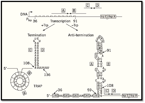Transcription attenuation was the first demonstration that organisms can exploit RNA structure to modulate gene expression. The first attenuation mechanism was elucidated by Charles Yanofsky and his coworkers for the Escherichia coli tryptophan biosynthetic operon (2) . In addition, many other amino-acid biosynthetic operons in enteric bacteria are regulated by transcription attenuation (eg, his, leu, ilv, pheA). In each case, the genetic information required for transcription attenuation is encoded within a 150–300-bp leader region located between the promoter and the first structural gene of the operon (1). Because the salient features of transcription attenuation are conserved in each system, the E. coli trp operon will be discussed, and the key differences with respect to other operons will be pointed out where appropriate.