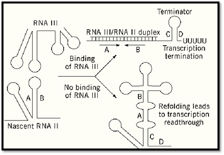 Figure 3. Model of plasmid-encoded repR transcription attenuation. Interaction of RNA III with the nascent RNA II (repR) transcript promotes terminator formation and transcription termination. In the absence of RNA III interaction, refolding of the nascent transcript blocks formation of the terminator, leading to transcription readthrough. Adapted from Brantl and Wagner (24).