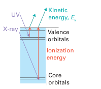 Figure 8.31 In photoelectron spectroscopy, high-energy electromagnetic radiation (UV for the ejection of valence electrons, X-ray for core electrons) expels an electron from its orbital, and the kinetic energy of the photoelectron is equal to the difference between the photon energy and the ionization energy of the electron.