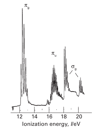 Figure 8.32 The UV photoelectron spectra of O2. Loss of an electron from 2Ϭg (see the MO energy-level diagram, Fig. 2.12) gives rise to two bands because the unpaired electron that remains can be parallel or antiparallel to the two unpaired electrons in the 1πg orbitals.