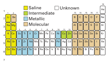 Figure 10.2 Classification of the binary hydrogen compounds of the s-, p-, and d-block elements. Although some d-block elements such as iron and ruthenium do not form binary hydrides they do form metal complexes containing the hydride ligand.The standard Gibbs energies of formation of the hydrogen compounds of s- and p-block elements reveal a regular variation in stability (Table 10.1). With the possible exception of BeH2 (for which good data are not available) all the s-block hydrides are exergonic (∆fGO< 0) and therefore thermodynamically stable with respect to their elements at room temperature. The trend is erratic in Group 13, in that only AlH3 is exergonic at room temperature. In all the other groups of the p block, the simple hydrogen compounds of the first members of the groups (CH4, NH3, H2O, and HF) are exergonic but the analogous compounds of their congeners become progressively less stable down the group, a trend that is illustrated by decreasing E-H bond energies (Fig. 10.3). The heavier hydrides become more stable on going from Group 14 across to the halogens. For example, SnH4 is highly endergonic (∆fGO> 0) whereas HI is barely so. These thermodynamic trends can be traced to the variation in atomic properties. The HH bond is the strongest single homonuclear bond known (apart from D-D or T-T bonds) and in order for a compound to be exergonic and stable with respect to its elements, it needs to have E H bonds that are even stronger than HH. For molecular hydrides of the p-block elements, bonding is strongest with the Period 2 elements and becomes progressively weaker down each group. The weak bonds formed by the heavier p-block elements are due to the poor overlap between the relatively compact H1s orbital and the more diffuse s and p orbitals of their atoms. Although d-block elements do not form binary molecular compounds, many complexes contain one or more hydride ligands. Metal hydrogen bond strengths in the d block increase down a group because the 3d orbitals are too contracted to overlap well with the H1s orbital and better overlap is afforded by 4d and 5d orbitals.
