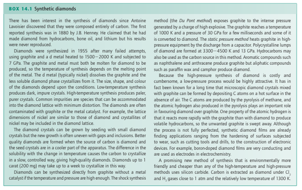 there are weaker forces between them. These forces are some times, but not very appropriately, called ‘van der Waals forces’ (because in the common impure form of graphite, graphitic ox ide, they are weak, like intermolecular forces), and consequently the region between the planes is called the van der Waals gap. Unlike diamond, graphite is soft and black with a slightly metallic lustre; it is neither durable nor particularly attractive. The conversion of diamond to graphite at room temperature and pressure is spontaneous (∆trs GO =-2.90 kJ mol-1) but does not occur at an observable rate under ordinary conditions: diamonds older than the solar system have been isolated from meteorites. Diamond is the denser phase (3.51 g cm-3 instead of 2.26 g cm-3), so it is favoured by high pressures, and large quantities of diamond abrasive are manufactured commercially by a d-metal-catalysed high-temperature, high-pressure process (Box 14.1). Thin films of boron-doped diamond are piezoresistive (their electrical resistance changes when pressure is applied) and are deposited on silica sur faces for use as high-temperature pressure sensors. The electrical conductivity and many of the chemical proper ties of graphite are closely related to the structure of its delocalized π bonds. Its electrical conductivity perpendicular to the planes is low (5 S cm-1 at 25°C) and increases with increasing temperature, signifying that graphite is a semiconductor in that direction. The electrical conductivity is much higher parallel to the planes (30 kS cm1 at 25°C) but decreases as the temperature is raised, indicating that graphite behaves as a metal, more precisely a semimetal,2 in that direction. This effect is most striking