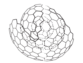 Figure 14.7 A proposed structure for a soot particle resulting from imperfect closure of a curved C-atom network. Graphite-like structures have also been proposed.‘Activated carbon’ is prepared from the controlled pyrolysis of organic material, including coconut shells. It has a high surface area (in some cases exceeding 1000 m-2 g-1), that arises from the small particle size. It is therefore a very efficient ad sorbent for molecules, including organic pollutants from drinking water, noxious gases from the air, and impurities from reaction mixtures. There is evidence that the parts of the surface defined by the edges of the hexagonal sheets are covered with oxide-tion products, including carboxyl and hydroxyl groups (8).