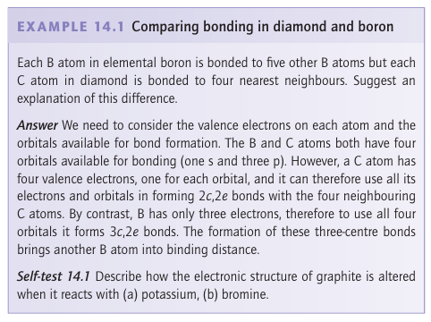 Key points: Amorphous and partially crystalline carbon in the form of small particles are used on a large scale as adsorbents and as strengthen ing agents for rubber; carbon fibres impart strength to polymeric materials There are many forms of carbon that have a low degree of crys tallinity. These partially crystalline materials have considerable commercial importance; they include carbon black, activated carbon, and carbon fibres. Because single crystals suitable for complete X-ray analyses of these materials are not available, their structures are uncertain. However, what information there is suggests that their structures are similar to that of graphite, but the degree of crystallinity and shapes of the particles differ. ‘Carbon black’ is a very finely divided form of carbon. It is prepared (on a scale that exceeds 8 Mt annually) by the combustion of hydrocarbons under oxygen-deficient conditions. Planar stacks, like those of graphite, and multilayer balls, reminiscent of the fullerenes, have both been proposed for its structure (Fig. 14.7). Carbon black is used on a huge scale as a pigment, in printer’s ink (as on this page), and as a filler for rubber goods, including tyres, where it greatly improves the strength and wear resistance of the rubber and helps to protect it from degradation by sunlight.
