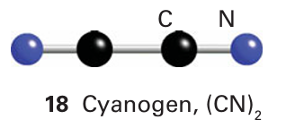 Unlike the neutral ligand CO, the negatively charged CN ion is a strong Brønsted base (pKa=9.4) and a much poorer Lewis acid π acceptor. The CO ligand can form complexes with met als in a zero-oxidation state as it can remove electron density through the π system. However, the coordination chemistry of CN is more often associated with metal ions in positive oxidation states, as with Fe2 in the hexacyanoferrate (II) complex, [Fe(CN)6]4- , as there will be less electron density on the metal ion. The toxic, flammable gas cyanogen, (CN)2 (18), is known as a pseudohalogen because of its similarity to a halogen. It dissociates to give .CN radicals and forms interpseudohalogen com pounds, such as FCN and ClCN. Similarly, CN is an example of a pseudohalide ion (Section 17.7).