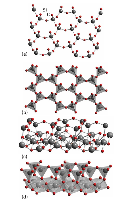 Figure 14.15 (a) A net of SiO4 tetrahedra and (b) its tetrahedral representations. (c) Edge view of the above net and (d) its polyhedral representation. The structures (c) and (d) represent a double layer from the mineral chrysotile, for which M is Mg. When M is Al3+ and the anions in the bottom layers are replaced by an OH- group this structure is close to that of the 1:1 clay mineral kaolinite.