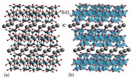 Figure 14.16 (a) The structure of 2:1 clay mineral such as muscovite mica KAl2 (OH)2 Si3 AlO10, in which K resides between the charged layers (exchangeable cation sites), Si4 resides in sites of coordination number 4, and Al+3 in sites of coordination number 6. (b) The polyhedral representation. In talc, Mg2+ ions occupy the octahedral sites and O atoms on the top and bottom are replaced by OH groups and the K+ sites are vacant.elements is the mineral kaolinite, Al2 (OH)4 Si2O5, which is used commercially as china clay. The electrically neutral layers are held together by rather weak hydrogen bonds, so the mineral readily cleaves and incorporates water between the layers. A larger class of aluminosilicates has Al3 ions sandwiched between silicate layers (Fig. 14.16). One such mineral is pyro phyllite, Al2 (OH)2Si4O10. The mineral talc, Mg3 (OH)2 Si4O10 , is obtained when three Mg2 ions replace two Al3 ions in the octahedral sites. As remarked earlier, in talc (and in pyrophyllite) the repeating layers are neutral, and as a result talc readily cleaves between them. Muscovite mica, KAl2(OH)2 Si3 AlO10 , has charged layers because one Al(III) atom substitutes for one Si (IV) atom in the pyrophyllite structure. The resulting negative charge is compensated by a K ion that lies between the repeat ing layers and results in greater hardness. There are many minerals based on a three-dimensional aluminosilicate framework. The feldspars, for instance, which are the most important class of rock-forming minerals (and contribute to granite), belong to this class. The aluminosilicate frameworks of feldspars are built up by sharing all vertices of SiO4 or AlO4 tetrahedra. The cavities in this three-dimensional network accommodations such as K and Ba+2 . Two examples are the feldspars orthoclase, KAlSi3O8 , and albite, NaAlSi3O8.