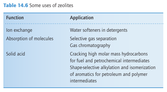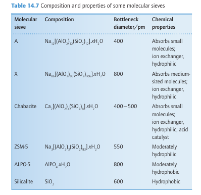 Key point: Zeolite aluminosilicates have large open cavities or channels giving rise to useful properties such as ion exchange and molecular absorption. The molecular sieves are crystalline aluminosilicates having open structures with apertures of molecular dimensions. These ‘micro porous’ substances, which include the zeolites in which cations (typically from Groups 1 or 2) are trapped in an aluminosilicate framework, represent a major triumph of solid-state chemistry, for their synthesis and our understanding of their properties combine challenging determinations of structures, imaginative synthetic chemistry, and important practical applications. The cages are defined by the crystal structure, so they are highly regular and of precise size. Consequently, molecular sieves capture molecules with greater selectivity than high surface area solids such as silica gel or activated carbon, where molecules may be caught in irregular voids between the small particles. Zeolites are used for shape-selective heterogeneous catalysis. For example, the molecular sieve ZSM-5 is used to synthesize 1,2-dimethylbenzene (o-xylene) for use as an octane booster in gasoline. The other xylenes are not produced because the catalytic process is controlled by the size and shape of the zeolite cages and tunnels. This and other applications are summarized in Table 14.6. Synthetic procedures have added to the many naturally occurring zeolite varieties and have produced zeolites that have specific cage sizes and specific chemical properties within the cages. These synthetic zeolites are sometimes made at atmospheric pressure, but more often they are produced in a high-pressure autoclave. Their open structures seem to form around hydrated cations or other large cations such as NR4 ions intro duced into the reaction mixture. For example, a synthesis may be performed by heating colloidal silica to 100 200°C in an autoclave with an aqueous solution of tetra propylammonium hydroxide. The microcrystalline product, which has the typical composition [N (C3H7 )4] OH (SiO2 )48, is converted into the zeolite by burning away the C, H, and N of the quaternary ammonium cation at 500°C in air. Aluminosilicate zeolites are made by in cluding high surface area alumina in the starting materials. A wide range of zeolites has been prepared with varying cage and bottleneck sizes (Table 14.7). Their structures are based on approximately tetrahedral MO4 units, which in the great major ity of cases are SiO4 and AlO4. Because the structures involve many such tetrahedral units, it is common practice to abandon the polyhedral representation in favour of one that emphasizes the position of the Si and Al atoms. In this scheme, the Si or Al atom lies at the intersection of four-line segments and the O atom bridge lies on the line segment (Fig. 14.17). This frame work representation has the advantage of giving a clear impression of the shapes of the cages and channels in the zeolite. Some examples are illustrated in Fig. 14.18. The important zeolites have structures that are based on the ‘sodalite cage’ (Fig 14.3), a truncated octahedron formed by slicing off each vertex of an octahedron (19). The truncation leaves a square face in the place of each vertex and the triangular faces of the octahedron are transformed into regular hexagons. The substance known as ‘zeolite type A’ is based on sodalite cages that are joined by O bridges between the square faces. Eight such sodalite cages are linked in a cubic pattern with a large central cavity called an α cage. The α cages share octagonal faces,