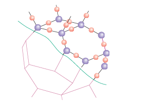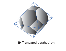Figure 14.17 Framework representation of a truncated octahedron (truncation perpendicular to the fourfold axes of the octahedron) and the relationship of Si and O atoms to the framework. Note that a Si atom is at each vertex of the truncated octahedron and an O atom is approximately along each edge. with an open diameter of 420 pm. Thus, H2O or other small molecules can fill them and diffuse through octagonal faces. However, these faces are too small to permit the entrance of molecules with van der Waals diameters larger than 420 pm.