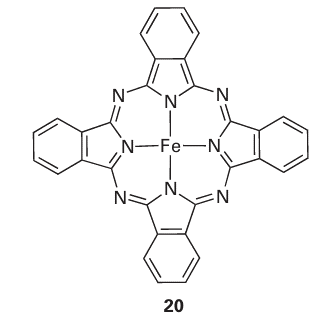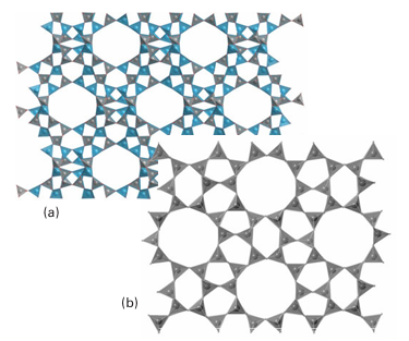 Figure 14.18 Two zeolite framework structures: (a) Zeolite-X and (b) ZSM-5. In each case just the SiO4 tetrahedra that form the framework are shown; nonframework atoms such as charge-balancing cations and water molecules are omitted.A brief illustration. To identify the fourfold and sixfold axes in the truncated octahedral polyhedron used to describe the sodalite cage we note that there is one fourfold axis running through each pair of opposite square faces for a total of three fourfold axes. Similarly, a set of four sixfold axes runs through opposite sixfold faces. The charge on the aluminosilicate zeolite framework is neutralized by cations lying within the cages. In the type-A zeolite, Na ions are present and the formula is Na12 (AlO2 )12 (SiO2)12. xH2O. Numerous other ions, including d-block cations and NH4, can be introduced by ion exchange with aqueous solutions. Zeolites are therefore used for water softening and as a component of laundry detergent to remove the di- and tri-positive ions that decrease the effectiveness of the surfactant. Zeolites have in part replaced polyphosphates because the latter, which are plant nutrients, find their way into natural waters and stimulate the growth of algae. In addition to the control of properties by selecting a zeolite with the appropriate cage and bottleneck size, the zeolite can be chosen for its affinity for polar or nonpolar molecules ac cording to its polarity (Table 14.7). The aluminosilicate zeolites, which always contain charge-compensating ions, have high affinities for polar molecules such as H2O and NH3 . By contrast, the nearly pure silica molecular sieves bear no net electric charge and are nonpolar to the point of being mildly hydrophobic. Another group of hydrophobic zeolites is based on the aluminium phosphate frameworks; AlPO4 is isoelectronic with Si2O4 and the framework is similarly uncharged. One interesting aspect of zeolite chemistry is that large molecules can be synthesized from smaller molecules inside the zeolite cage. The result is like a ship in a bottle because once as sembled the molecule is too big to escape. For example, Na+ ions in a Y-type zeolite may be replaced by Fe+2 ions (by ion exchange). The resulting Fe+2-Y zeolite is heated with phthalonitrile, which diffuses into the zeolite and condenses around the Fe+2 ion to form iron phthalocyanine (20), which remains imprisoned in the cage.